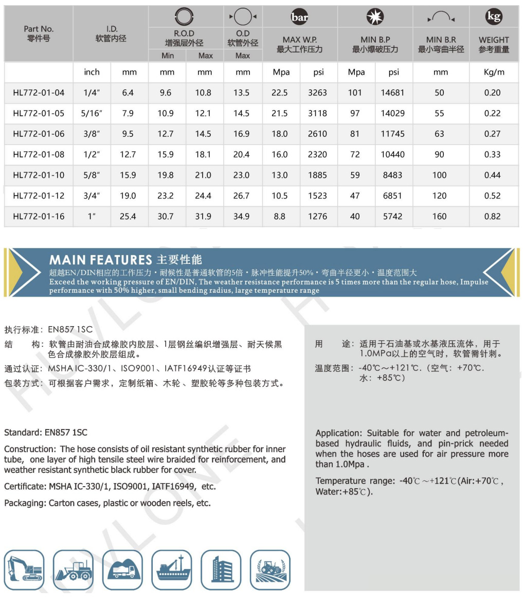 符合/超越DIN EN857 1SC一層鋼絲編織橡膠軟管