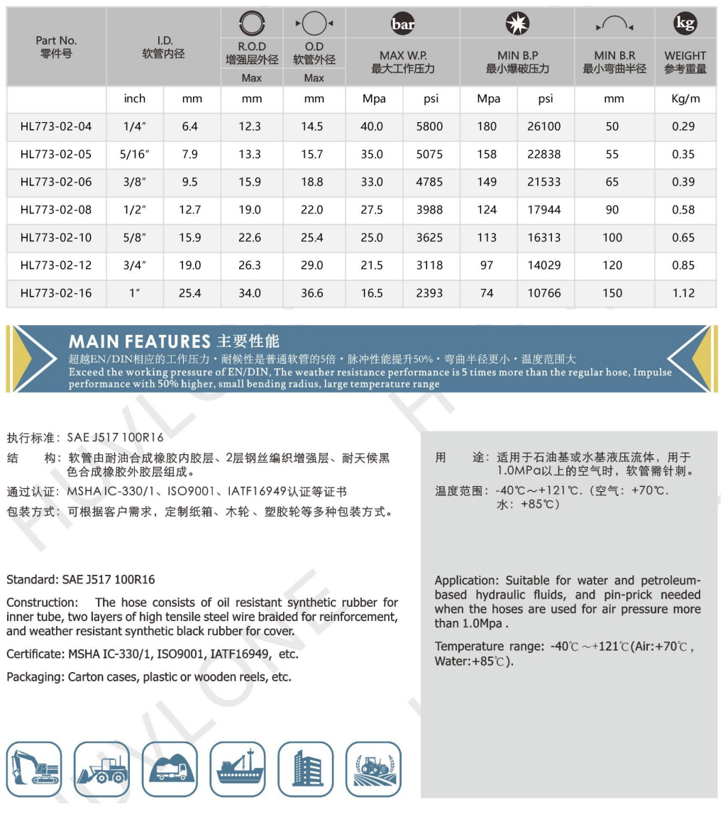 產(chǎn)品用途:適用于石油基或水基液壓流體,用于1.OMPa以上的空氣時,軟管需針刺。