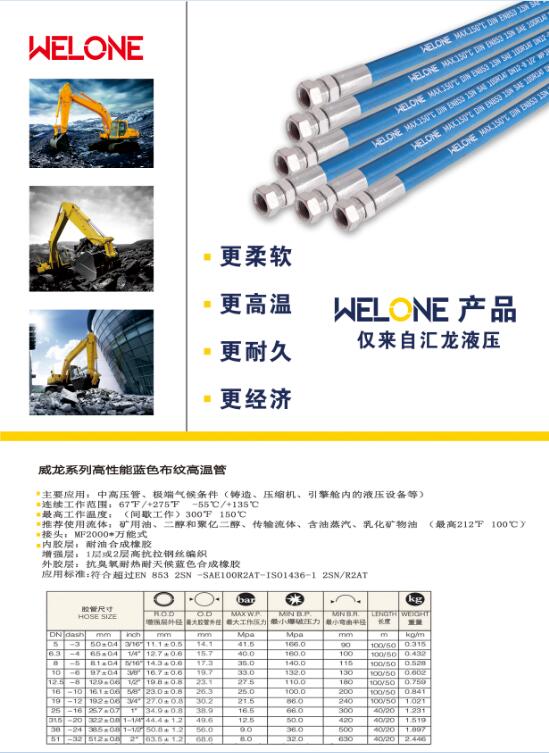 藍(lán)色棉線高溫管壓力符合及超越SAE標(biāo)準(zhǔn)·耐溫度范圍更大·具備突出的持續(xù)性耐高溫和抗紫外線特點(diǎn),廣泛用于工程機(jī)械等行業(yè)。