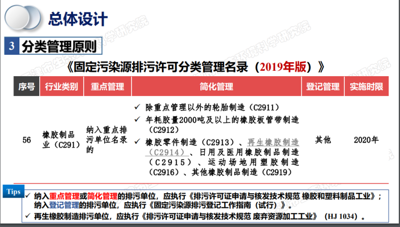 《技術規(guī)范》適用于執(zhí)行《橡膠制品工業(yè)污染物排放標準》(GB 27632)及輪胎翻新排污單位排放大氣污染物、水污染物的排污許可管理范圍。再生橡膠制造不適用于本標準,其適用于《排污許可證申請與核發(fā)技術規(guī)范 廢棄資源加工工業(yè)》(HJ 1034)。