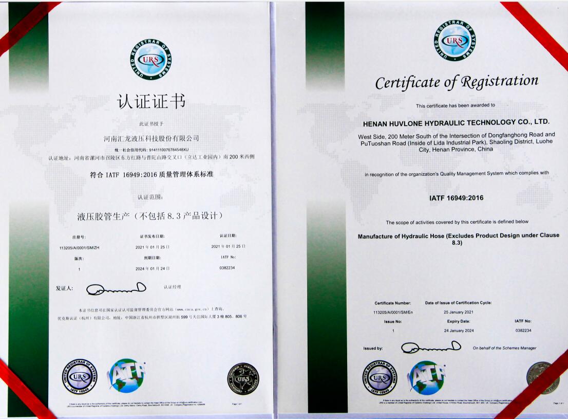 該證書的取得,標志著公司的液壓膠管產(chǎn)品獲得了進入汽車市場領域的綠色通行證,為公司積極開拓車用液壓膠管市場奠定了堅實的基礎,為參與汽車行業(yè)市場競爭提供了有力保障。