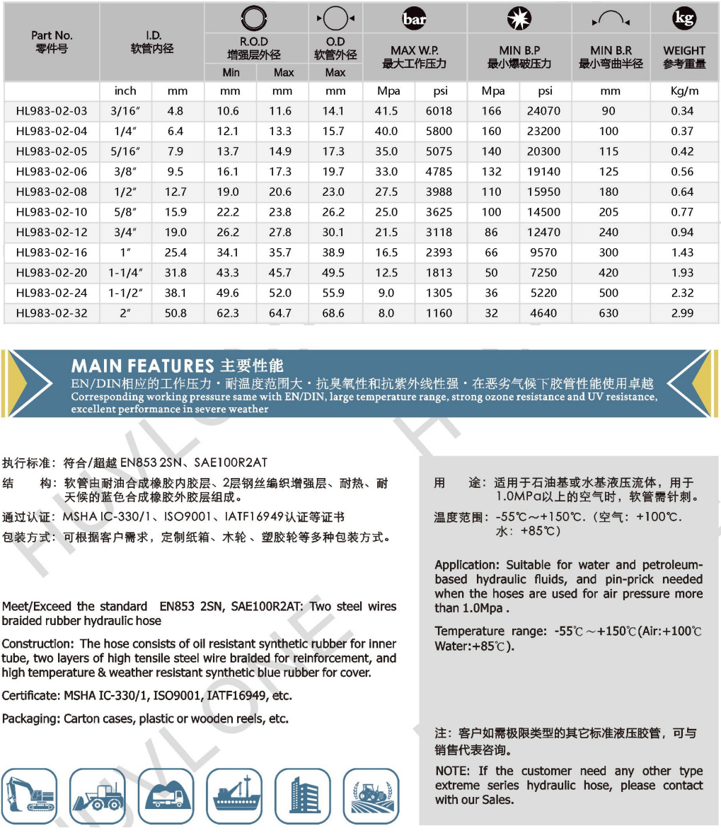 Meet/Exceed the standerd ofEN853 2SN/SAE 100R2AT Two steel wires breaided rubber hydraulic hose with high & Low temperature - resistance