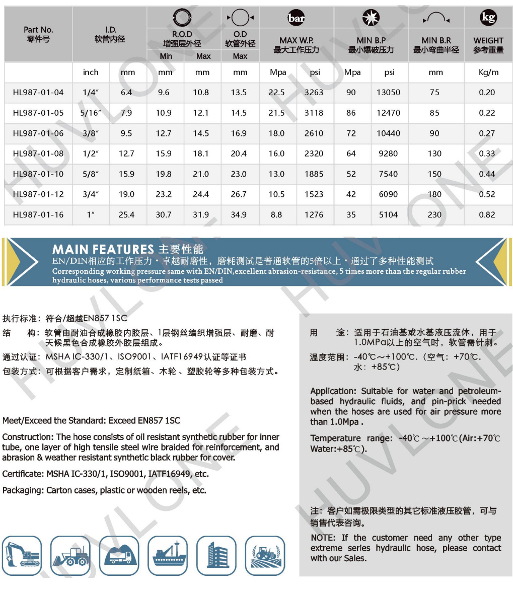 Meet/Exceed the standard of DIN EN857 One steel wire braided rubber hydraulic hose with abrasion - resistance